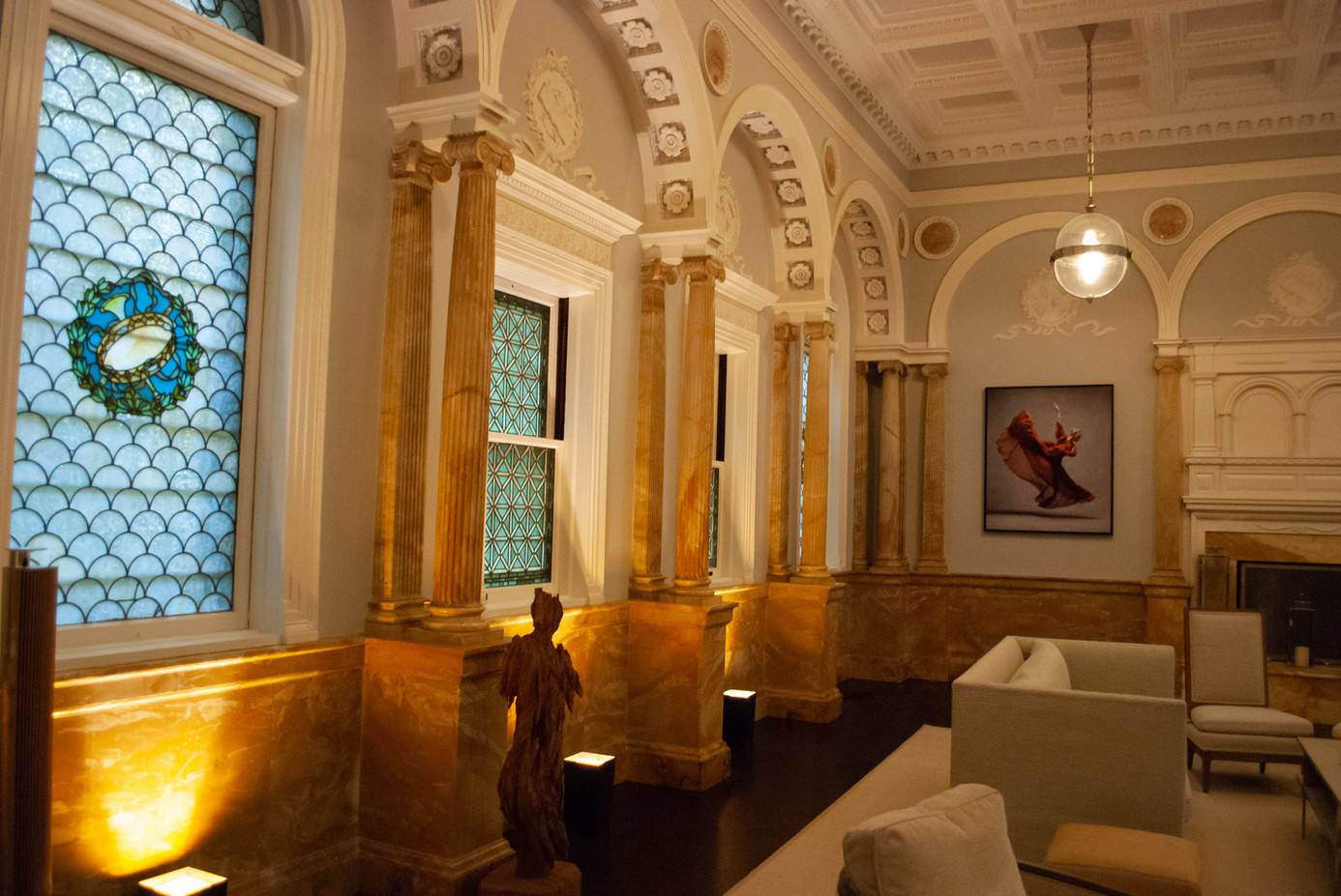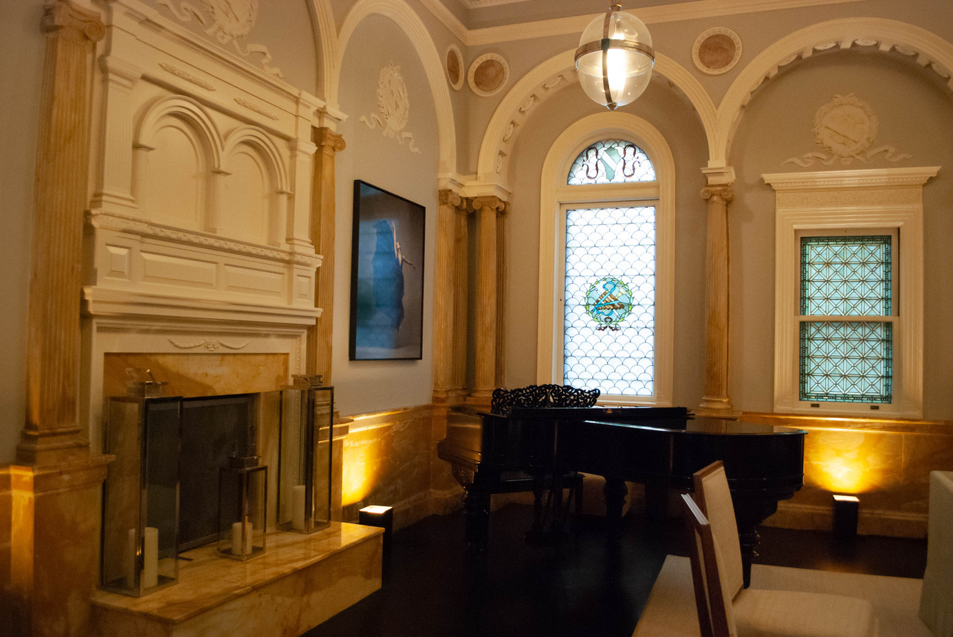 The unique space was added to the back of the home in 1897 to host private performances for international musicians. A half dome ornamented with plaster rosettes, a coffered ceiling with a raised corona, and imported marble floors and columns highlighted the performance stage. Famous musicians such as Ferruccio Busoni, Arthur Rubinstein, and Ignacy Paderewski graced the space in its early years and it continued playing host to famous artists into the 1940s.