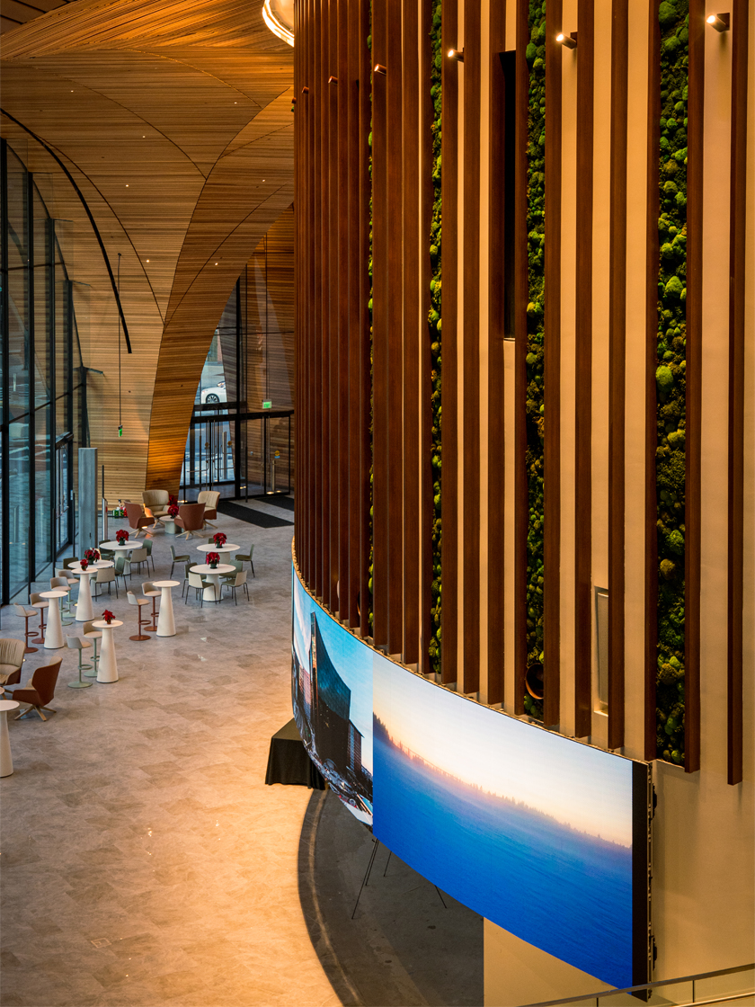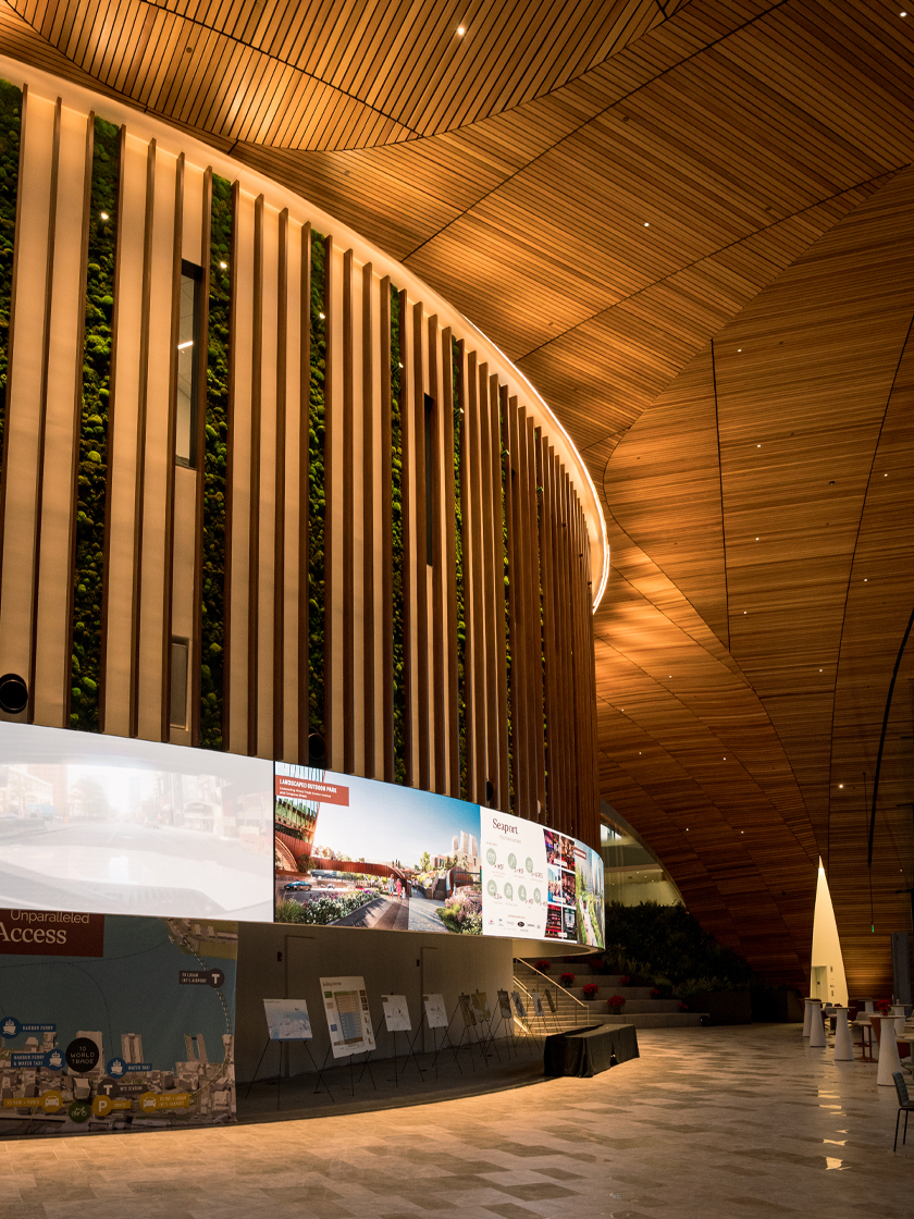 Today, the curved LED wall at 10 World Trade stands as a signature feature of the building and a new visual landmark for the Seaport. Stretching through the great hall and visible from the street, it serves as both a storytelling canvas and a statement of intent. More than a display, the video wall defines the experience of 10 World Trade. It’s an architectural expression of innovation that connects the building, its tenants, and the city beyond its walls.