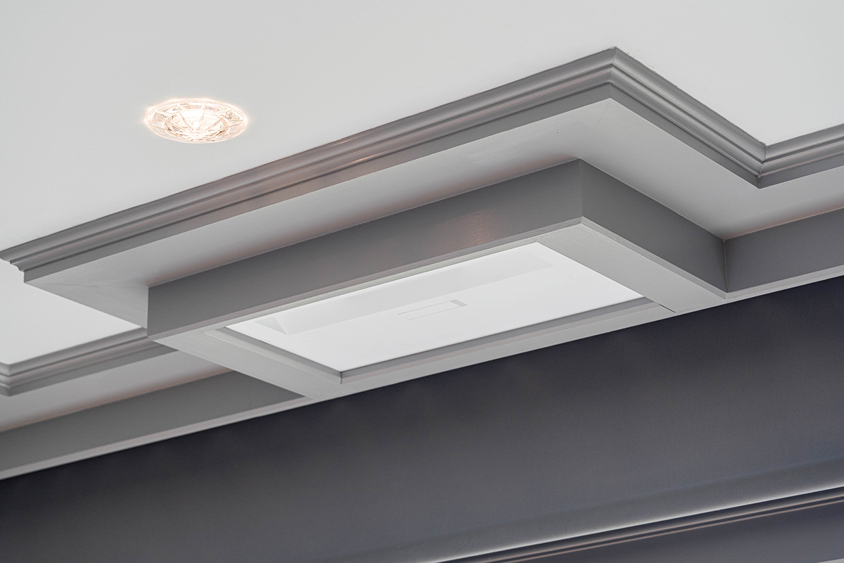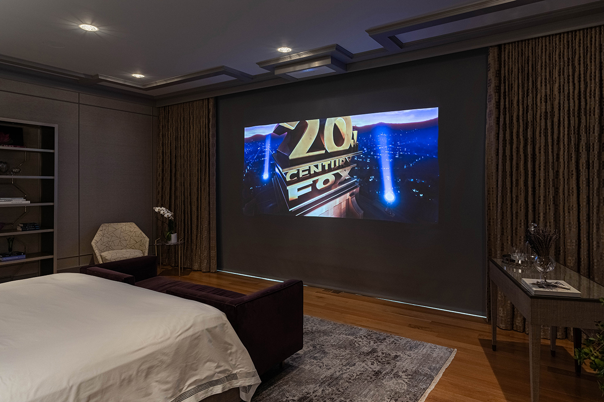 Due to the design of the room and the abundance of windows, we took a unique approach to the AV in the room, installing a short-throw projector designed to be nearly hidden in the ceiling, installing Sonance Architectural speakers, as well as a projector screen with blackout shades. Thanks to the simplicity of control, the homeowners can switch between open windows, highlighting the view to an immersive cinematic experience at the touch of a button.