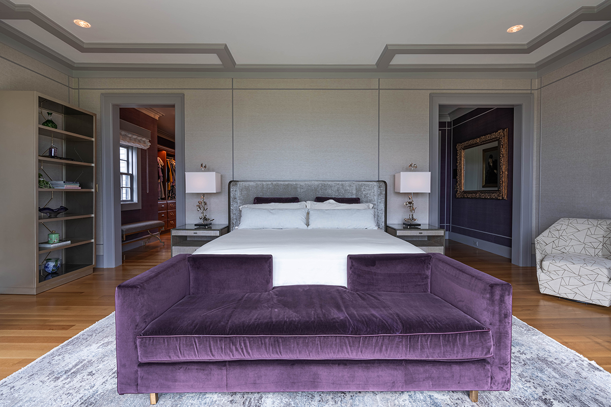 The comprehensiveness of the smart home solutions installed and how seamlessly they work with each other without compromising the design makes this primary suite stand out as particularly unique. In the master bedroom, scene control is done at the touch of a button. It allows the homeowner to adjust or check lighting, temperature, AV, and security from a Lutron SeeTouch keypad or smart phone, thanks to integration with a Lutron HomeWorks QS system integrated into a larger Savant system. The projector and screen are unique to a typical master bedroom, and were a solution that maintained the beautiful view and didn’t interfere with the custom Lutron drapery and roller shades.