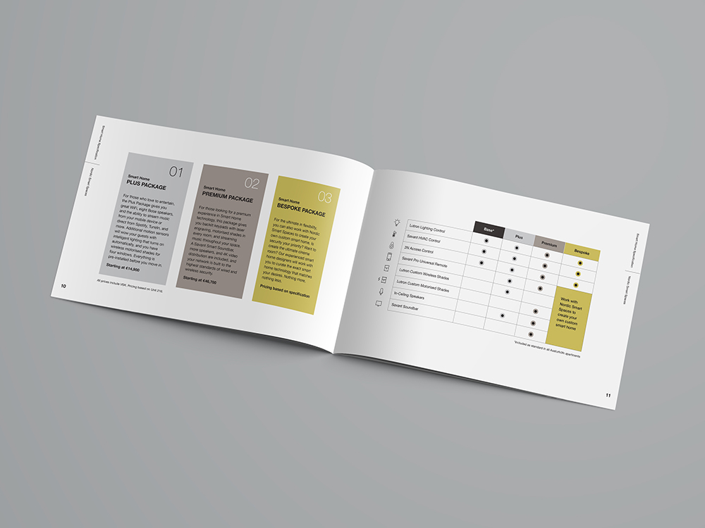Showcasing the value of smart home technology, our luxury brochure highlights how technology enhances everyday life in Austurhofn. Importantly, In these luxury condominiums on the waterfront in Reykjavik, TSP Smart Spaces provides home automation technology to tenants in a customizable package. The brochure features a myriad of options to fit the diverse range of clientele. The created Smart Home Specification and Price Guide outlines the options available for potential buyers, clearly color-coded and written in an easy-to-understand format for non-technical buyers.