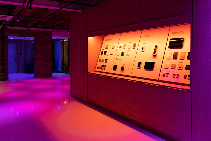 On top of this foundation, Lutron Homeworks QSX, Ketra Lighting, and Lutron Sivoia and Palladiom window treatments are utilized throughout our entire showroom, allowing us to showcase the complete set of Lutron solutions for anyone who walks through our doors. Other solutions in the space include 2N access control, Meraki security cameras, Biamp and Shure commercial AV, and residential AV from LG, Sonance, Amina, Artcoustic, and K-Array. As an example of technology integration, varying audio technologies are used throughout, allowing you to see and hear the differences between exposed, architectural, and invisible speakers.