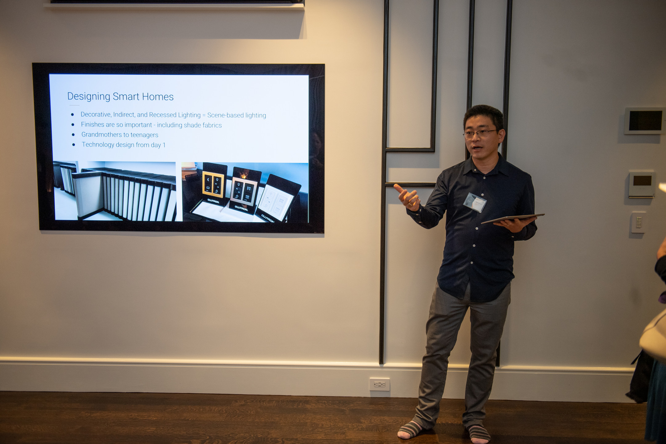 The topic: Smart Homes for Small Spaces. Founder Michael Oh and Director of Smart Spaces Aaron Stallings demonstrated three different units at the Hooper Mansion. These have been kitted out with varying levels of smart technology. From a retrofitted apartment to a 4,500 sq ft complete custom build, TSP demonstrated Lutron lighting control, Savant whole home control, Alexa voice control and even Amina invisible speakers.